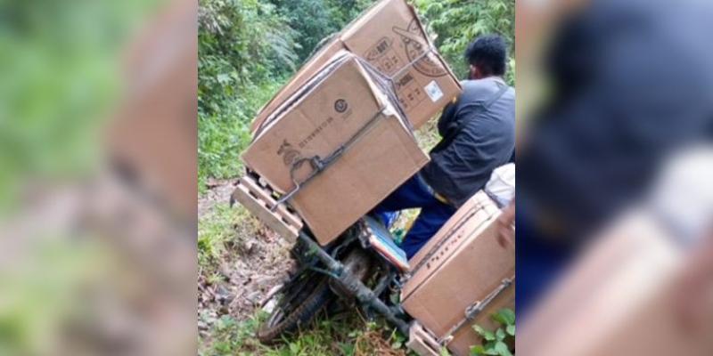 The dirt bike toppled over from the weight of the cartons about 15 times every half mile of the trek.